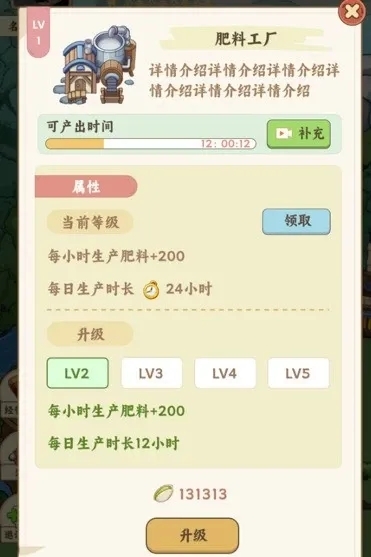 玩家将拥有一座化肥工厂,它是游戏里的核心建筑之一,能持续不断地生产肥料。肥料在游戏中是相当关键的资源,可用于升级工厂,进而让肥料的产出量得到提升。玩家每日登录游戏,都能得到一定时长的肥料生产时间,另外,观看广告也能额外获取更多的肥料产出时长。