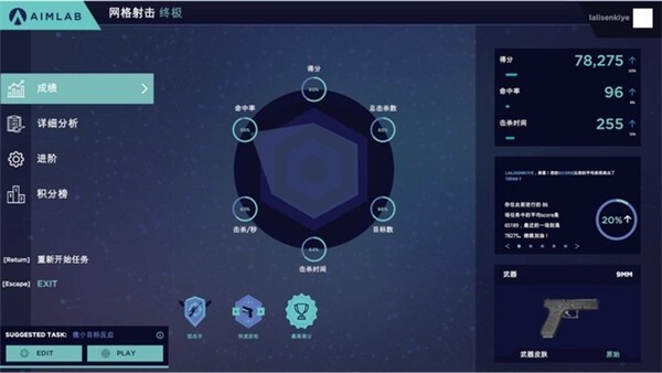 为了成为最强者而刻苦训练,并不代表在这个过程中就无法体会到乐趣。Aim Lab 移动版设有15种小游戏形式的任务(后续还会增添更多),这些小游戏都聚焦于冲击排行榜榜首所需的几项关键技术。通过训练可以提升速度、命中率、反应时间、反应射击、快速反应、头部射击等多项能力指标。