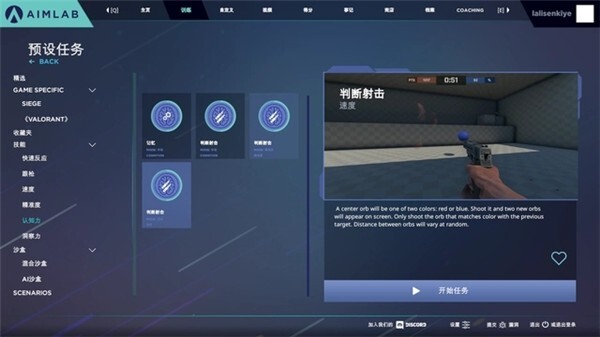 另外还想补充一点,在aimlab里还有认知力和洞察力这两个训练项目。认知力训练方面,比较推荐尝试判断射击练习。在这个练习中,敌方目标和友方目标会在蓝色目标与红色目标之间持续切换,玩家需要自行判断何时该开枪、何时该停火,以免误伤队友。这个练习对于《求生之路》《Pubg》这类容易混淆队友和敌人的游戏来说,能起到一定的辅助提升作用。