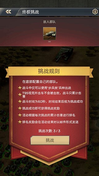 在终极挑战里,玩家需在限定兵种的条件下与BOSS对战,系统会依据最终的累计伤害值进行排名,玩家可据此获取相应奖励。