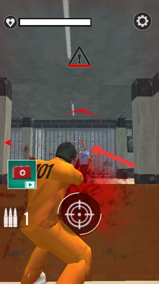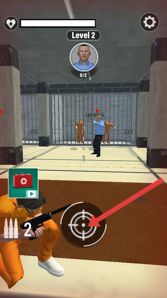 屏幕上方提示需消灭2名带有头像标识的特定敌人,射击时留意左下角的弹药余量,点击急救包即可恢复状态。