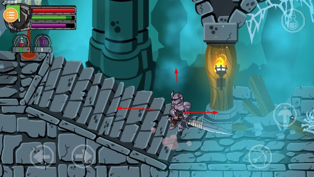 你需要操控角色在石质地牢场景里移动,借助方向按键在台阶与平台之间行进,去探索场景内的不同区域。