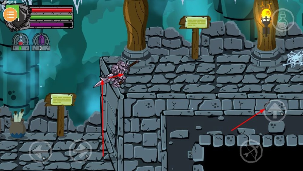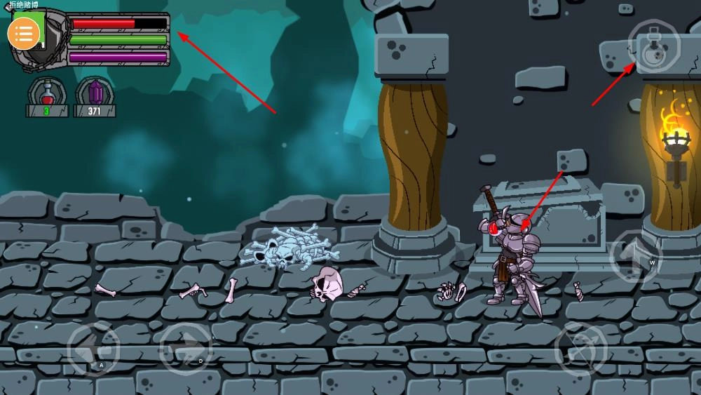 请留意屏幕左上角的生命值与能量值显示条,一旦生命值有所下降,你可以借助界面里的药水类道具来恢复自身状态。
