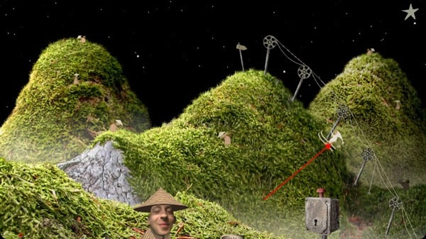 3、点击右侧的绳子,再点击类似信箱的机关上方的红色按钮,将小人吊运上来。