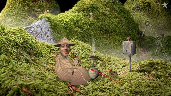 2、切换画面后,点击画面中间体型最大的那位农民的烟袋,他会将烟吸完。再次点击烟袋,农民会把烟管扔到一边。接着点击烟管,即可修复机关。