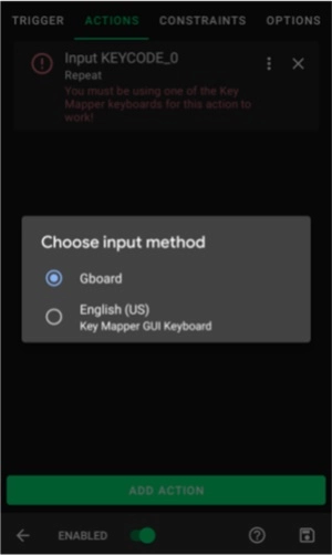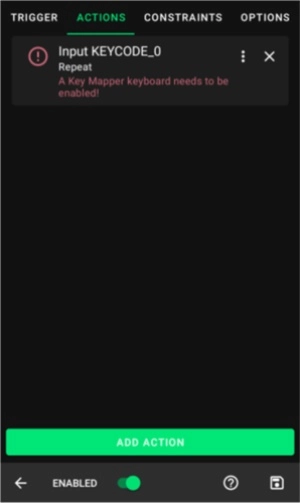 在这个简单的演示里,我会从KEYCODE选项卡中选中KEYCODE_0,这个操作能模拟按下键盘上的0键。键映射器会提示你是否需要执行额外步骤来确保该动作正常运行。图片里的操作显示了一条错误消息,提示你要“启用”键映射器键盘,点击这个操作就能跳转到对应的设置位置,方便你修复错误。接下来我会讲解如何设置关键代码动作,毕竟这类动作的使用频率是最高的。