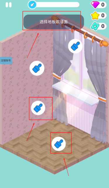 3、点击刷子图标就能启动装修流程,首先挑选地板和墙面,按照教程的指引操作就行。