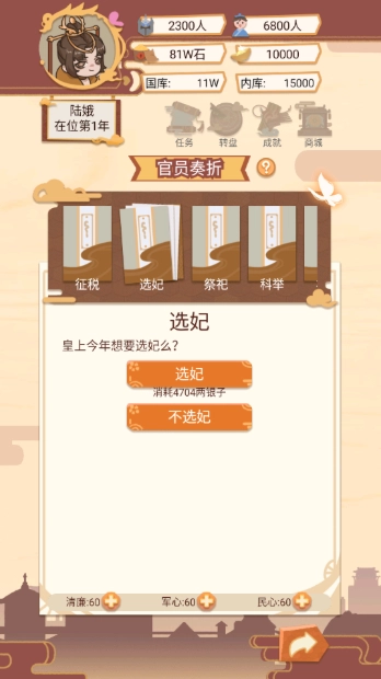 2、每年我们都有权决定是否进行选妃,选妃的目的是补充后宫的人员数量,而且每次选妃只能挑选一位女子纳入后宫成为妃子。