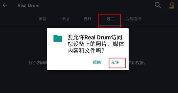 2、 然后点击歌曲,一定要允许该权限才可以读取本地歌曲哦!