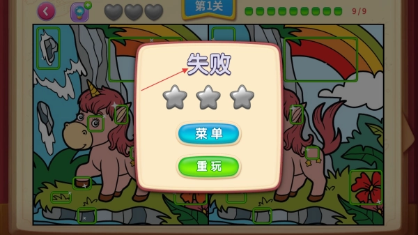 要是在指定时间里没能找完所有不同之处,屏幕就会弹出挑战失败的界面,界面正中间会显示失败的提示文字。