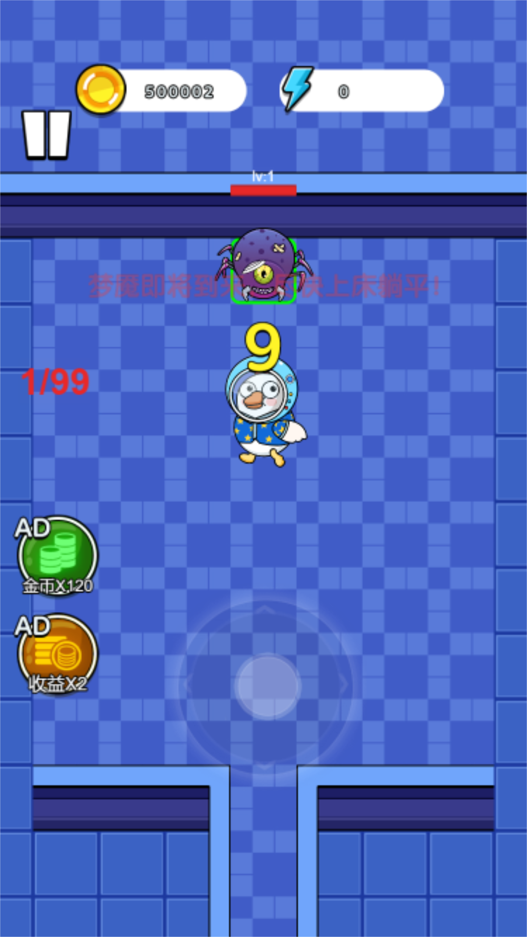 1. 操控鸭子移动:滑动屏幕的左右或上下方向来控制鸭子移动,以此躲避障碍物与敌人。