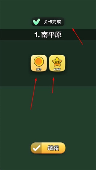 当成功通过关卡后,屏幕会显示关卡完成的提示,同时你将获得金币、经验值之类的奖励,之后只需点击继续按钮,就能进入下一个关卡。