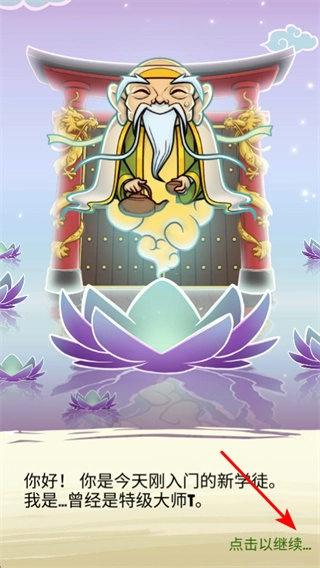 推动修仙故事发展,点击“继续”按钮,依照特级大师的引导,开启修仙的入门篇章,熟悉游戏的世界观设定与修仙的相关规则。
