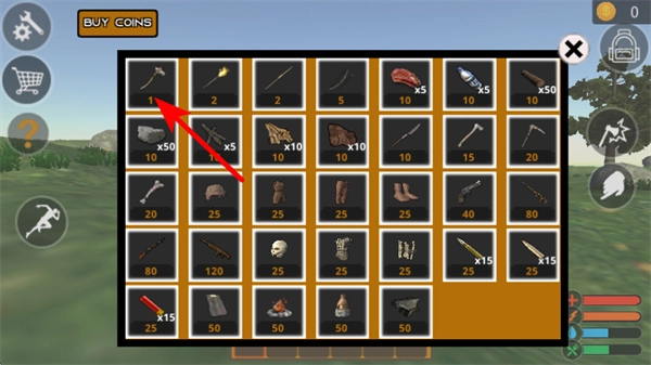 进入商店界面后,挑选武器、材料等所需道具完成兑换,填补生存资源的不足,增强在丛林里的生存本领。
