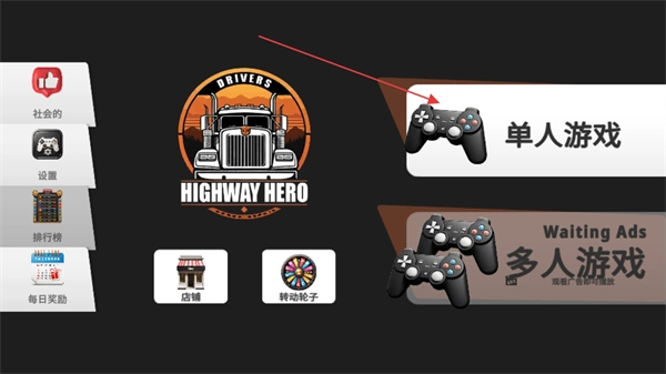 这是车手公路英雄的主界面,点击“单人游戏”即可进入单人游玩模式,界面上还设有店铺等功能入口,可供你使用。