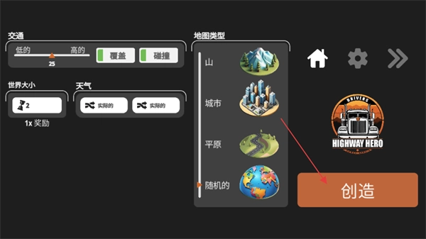 在这款游戏的设置界面里,你可以对交通、地图类型等各项参数进行调整,等设置都完成之后,只要点击创造按钮,就能进入到相应的游戏模式了。