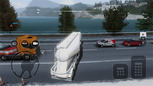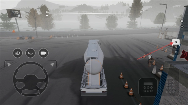 这是游戏的驾驶操作界面,选择D档可控制车辆进入前进状态,搭配方向盘等控件可完成卡车的驾驶操作。