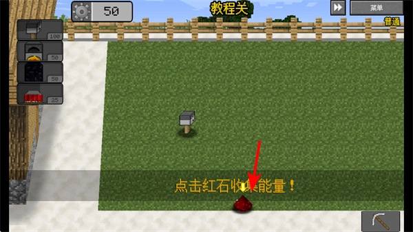 在战场上点击红石就能收集能量,这些能量是部署和升级器械的关键资源,持续收集可以快速增加防御装置的数量,从而加强对僵尸的火力压制。