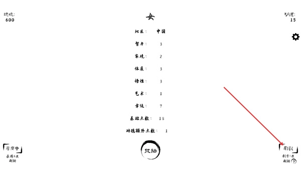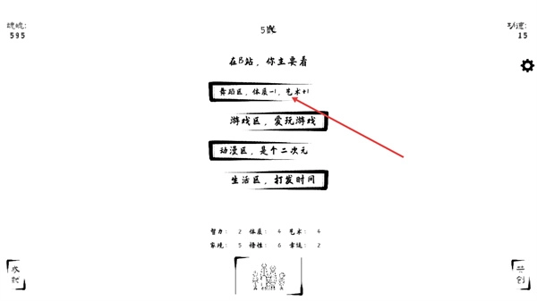 在这个界面里,你可以选择对应的分区选项“舞蹈区体质-1艺术+1”,一旦选定,系统就会相应地调整角色的属性数值,以此来推进投胎的流程。