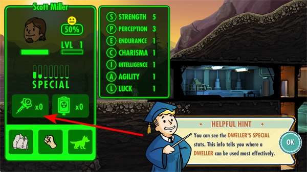 点击避难所外的居民,打开其属性面板。居民的SPECIAL属性会影响他们在不同房间的工作效率,借助查看这一面板,能够更合理地为他们分配岗位。
