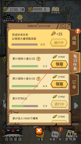 完成每日任务,比如累计招待小道士、达到一定打扫次数等,就能领取丰厚的糖果奖励。这些糖果可以用来兑换餐厅所需的各类资源,或者解锁全新的游戏内容,助力你的怪物餐厅一步步发展壮大。