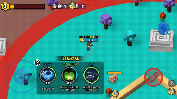 选择旋风斩、提升生命值上限、炮台这类升级技能,来增强战斗能力,以此应对剩余的敌人。