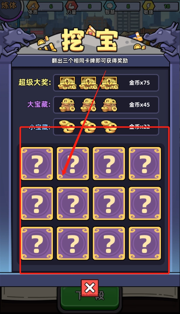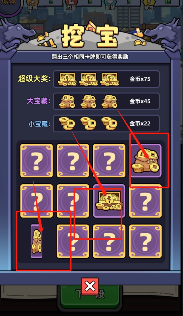 要是点击三次出现的金钱图案都相同,就能得到金钱奖励。