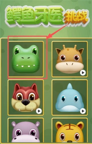 进入游戏后,可点击红色箭头指向的绿色鳄鱼头像,也能选择任意动物头像下方的白色三角按钮,以此启动治疗流程。
