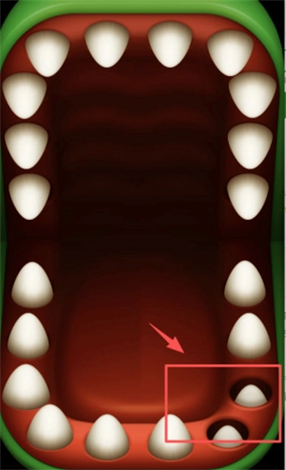 2、观察口腔内部,留意被红框与箭头标注的下颚右侧小牙。避开口腔深处的黑暗区域,避免被咬。