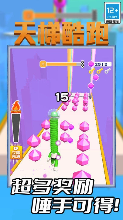 天梯酷跑为玩家带来极具冲击力的垂直跑酷体验,你将在没有尽头的天梯之上开启一场惊险万分的攀登之旅。游戏运用3D立体的场景构建方式,以绚烂缤纷的色彩结合富有动感的光影特效,打造出如同梦境一般的视觉享受。玩家只需通过简单的滑动屏幕,就能操控角色向左右两侧跳跃,在快速奔跑的过程中灵活躲避各种障碍,同时收集沿途的道具。随机生成的天梯结构,再搭配上多种多样的机关陷阱,保证了每一次挑战都能让你感受到全新的乐趣。你还可以解锁风格独特的个性角色以及酷炫华丽的特效,并且在排行榜上和来自全球的玩家比拼较量,一决高下。流畅顺滑的操作手感,加上节奏明快的BGM,让你能够尽情享受肾上腺素急剧上升的跑酷乐趣。