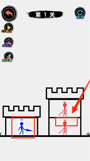 想要完成爬塔任务就得参与战斗,那些数字对应的是武力值,只要点击需要对战的红色火柴人,就能开启这场较量了。