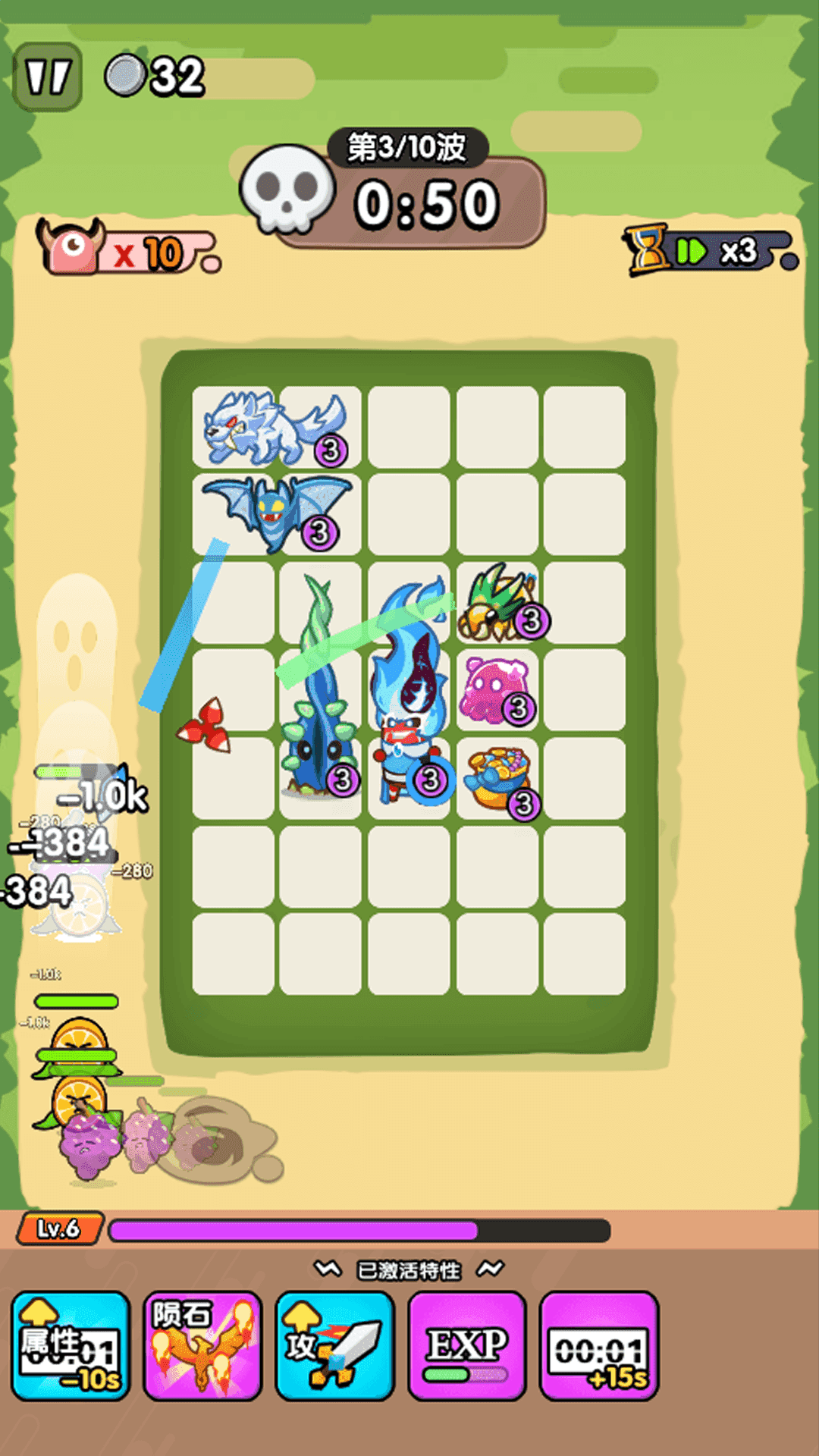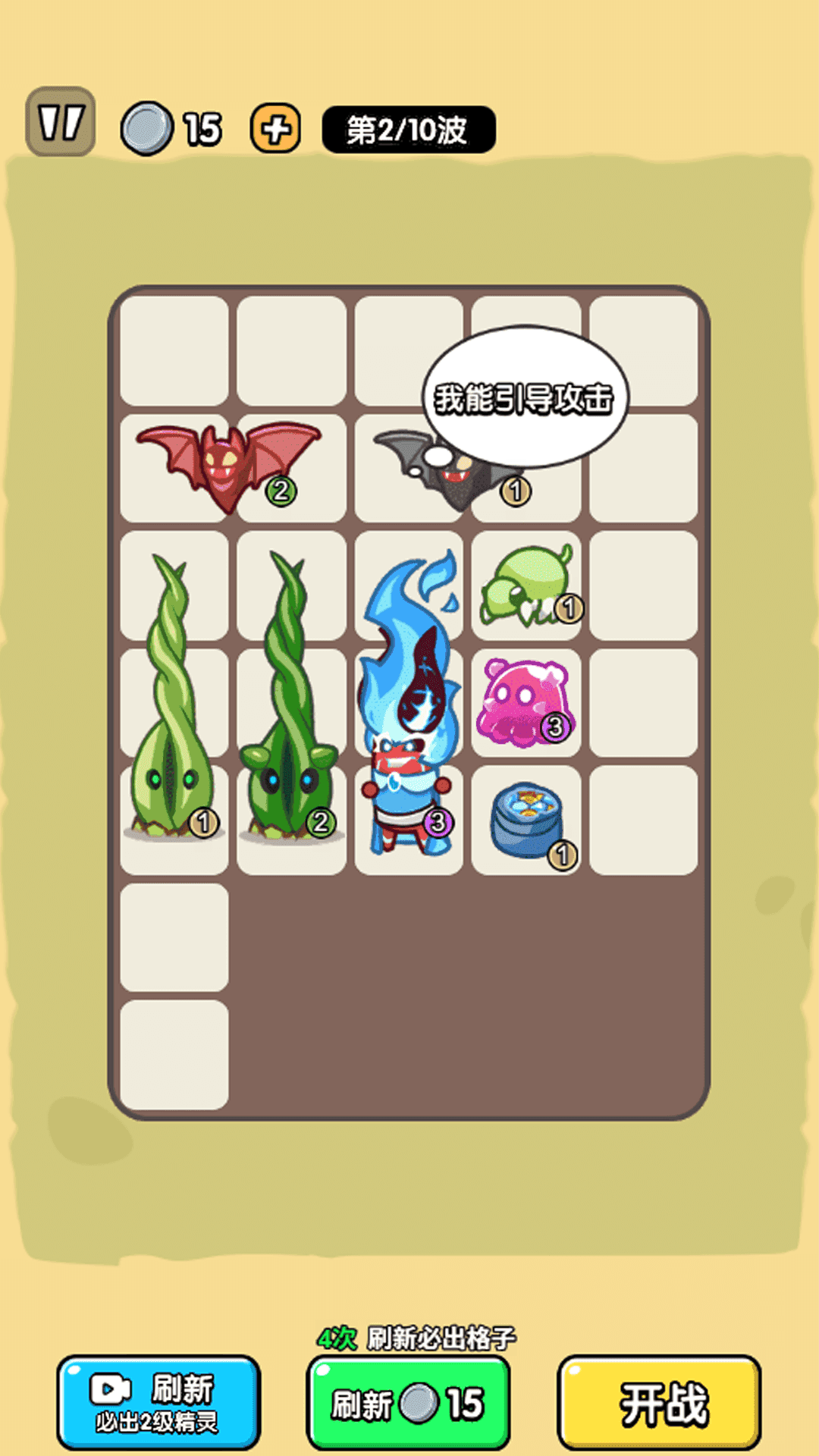 1、通过点击并拖拽的方式把精灵放置到战场网格里,网格数量在有限空间内是固定的,要依据精灵的攻击范围来合理规划它们的摆放位置。