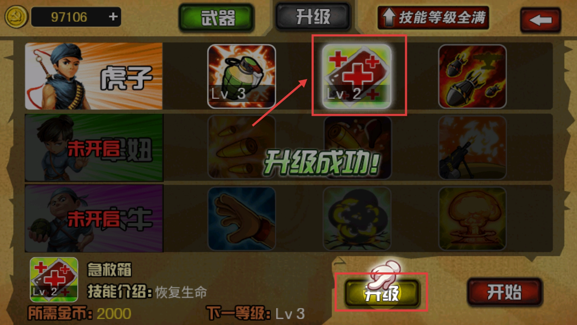 进入技能界面后,使用金币对【急救箱】技能进行升级,以此增强回血效果,让后续的战斗能够更加轻松。