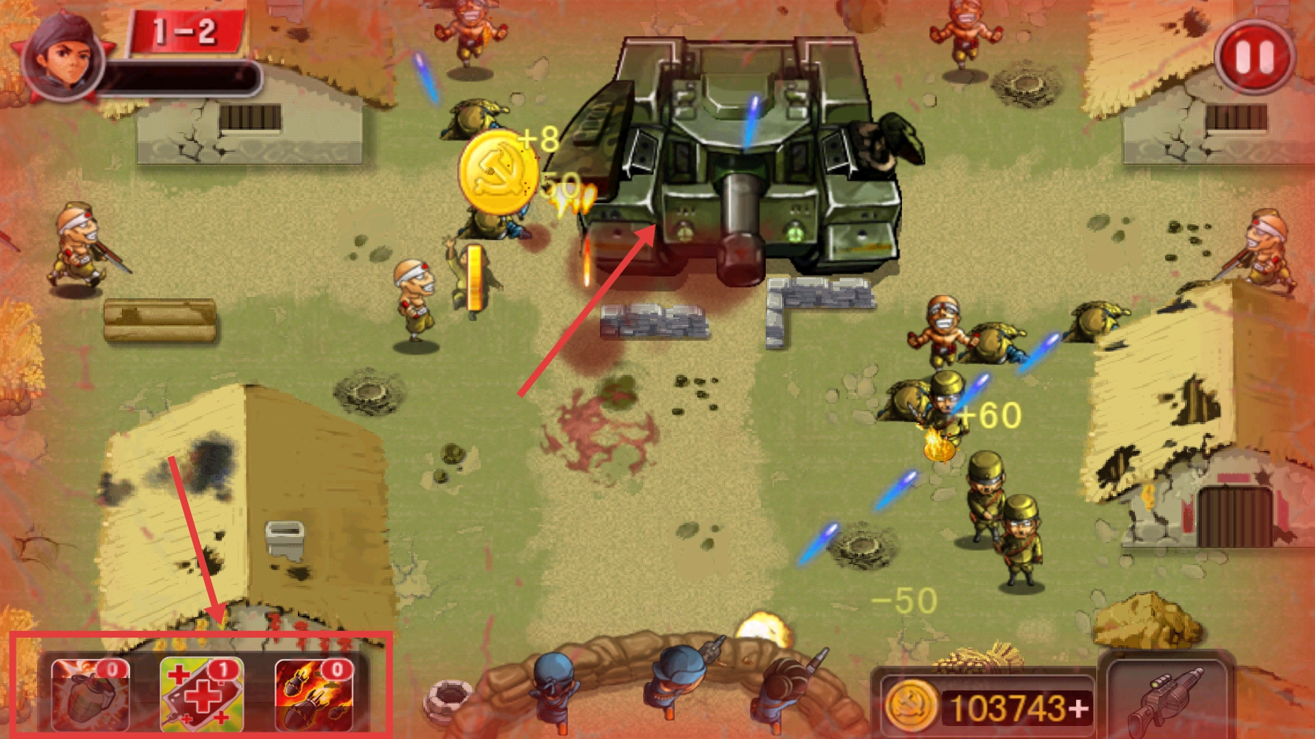 消耗金币可以用来升级技能以及解锁新技能,当血量不足时,点击急救箱就能回血,还需要根据敌人的队形来调整攻击策略。