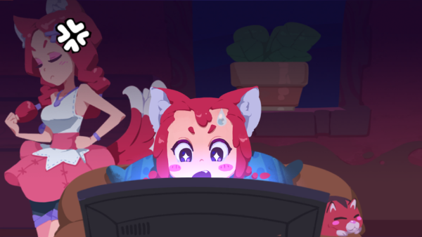 2、进入一段短暂又有趣的剧情环节,阿哩因为熬夜玩电脑被妈妈发现,最后被催促着去睡觉了。