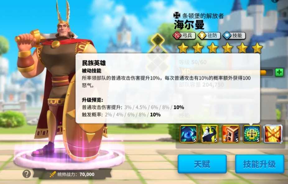 四技能,民族英雄:提升普攻伤害并附加怒气获取机制,属于偏运营向的持续型收益。虽有概率浮动,但在多段普攻频繁触发的弓兵编队中,实际收益可观,尤其适配高攻速流派。