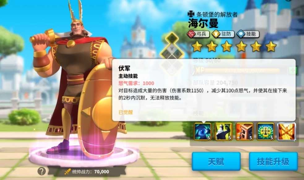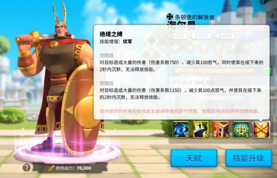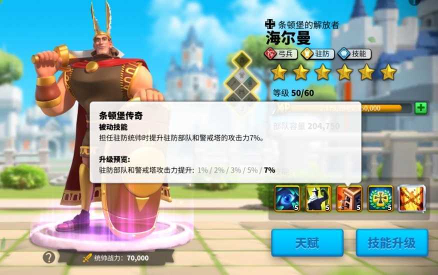 三技能“条顿堡传奇”:能小幅提升驻防属性与攻击输出,是功能补充类技能。在当前版本中,驻防位置的统帅选择更侧重于生存能力更强、减伤效果更稳定的类型,因此该技能更多时候被当作过渡期的辅助技能来使用。