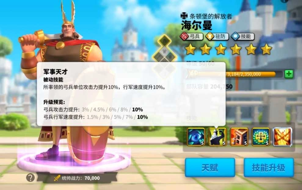 二技能“军事天才”:能直接让所率领的弓兵攻击力与行军速度各提升10%,是典型的即战力增益效果。该技能在高速拉扯战局或从侧翼切入的战斗场景里作用突出,不过要留意,尽量别和成长周期太长的统帅进行过度绑定培养。