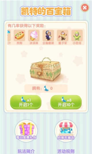 收集月亮石后前往百宝箱区域,单次投入一枚即可开启神秘宝匣,若凑齐八枚,还可一键连开十箱,内含玩偶公仔、限定食物、成长道具与金币惊喜。