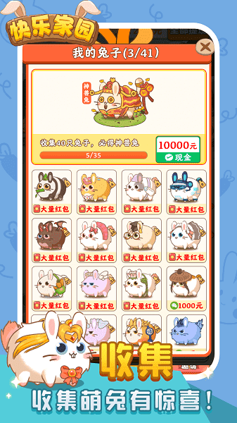 《快乐家园》是一款家园模拟养成游戏。在这个充满治愈感的世界里,你将成为一名田园生活家,既可以通过合成可爱的兔子来壮大自己的兔群,也能精心打理田地、种植各类作物,让农场变得生机勃勃,收获丰厚的收益。每一只兔子都拥有独一无二的外形和习性,而通过趣味十足的抽奖活动,你还有机会邂逅稀有神兔,解锁专属的互动内容与成长彩蛋。无论是照料小动物、采摘成熟的果实,还是用心装饰庭院,每一个细节都传递着舒缓治愈的节奏。