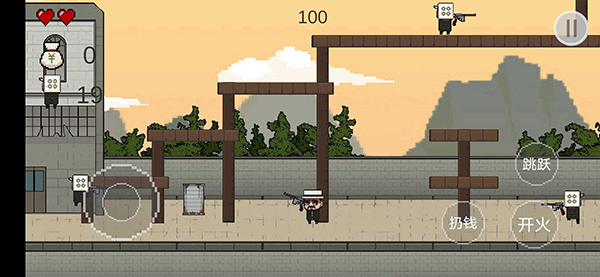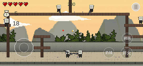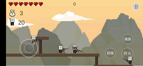 选定单摇杆后,左下区域负责角色位移,右侧按钮集跳跃、射击、投掷金币于一体;左上角实时显示血量与当前拾取的钱袋数量,信息简洁,不干扰战局。