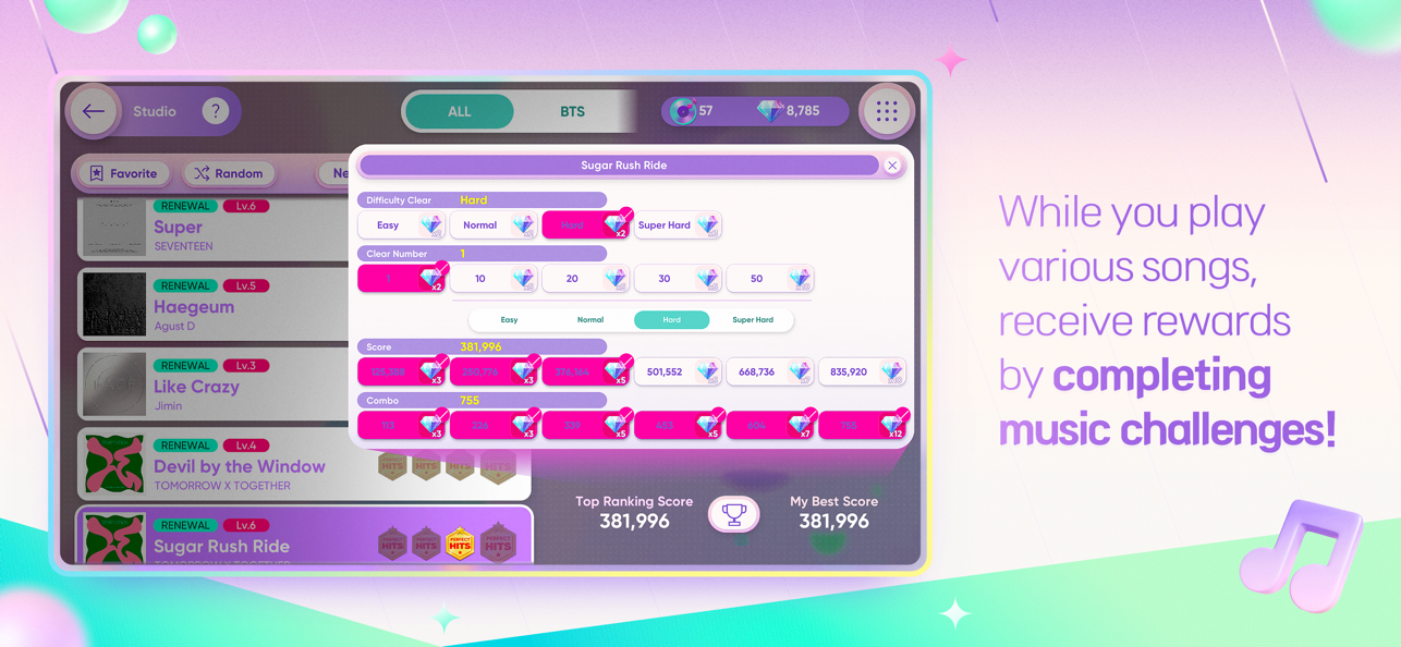 在曲库中挑选一首心仪曲目,并根据自身熟练度选择Easy、Normal、Hard或Master难度。