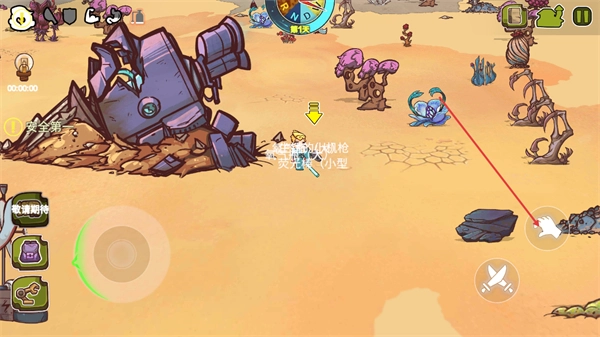在当前游戏界面中,通过点击左侧的移动摇杆来操控角色,使其移动到采矿飞船所在的区域,以此推进游戏的相关进程。