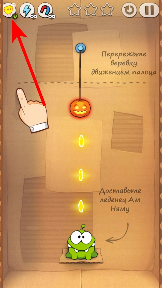 基础绳索切割玩法:玩家通过单指滑动操作切断处于受力状态的连接绳索,借助重力作用使糖果自然下落,最终落入小怪兽口中。初始关卡的设计旨在培养玩家对物理轨迹的基础判断能力。
