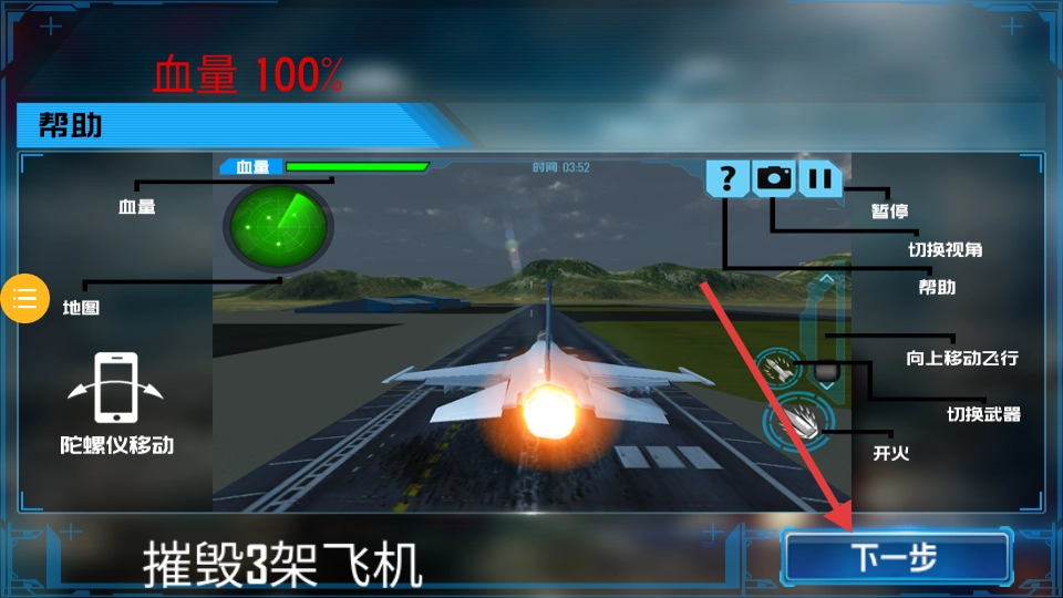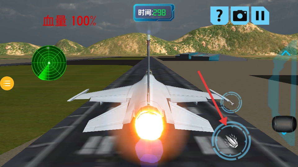通过虚拟摇杆控制飞行方向,按键释放导弹或机枪。