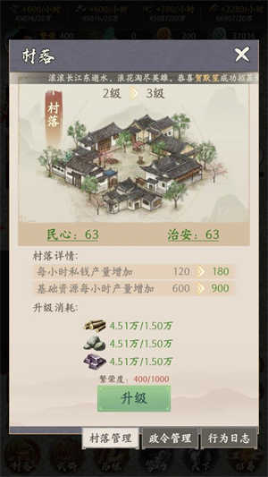 主城中央的村落是发展根基,持续升级粮仓、校场、工坊等设施,能显著提升资源产出与部队训练效率。