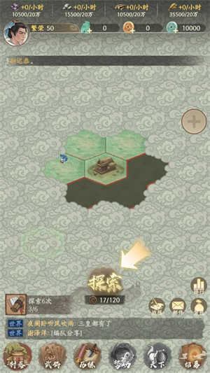 进入主城后,轻点“探索”按钮即可派遣斥候踏足未知疆域,地图边缘的雾气将随行动逐步消散。