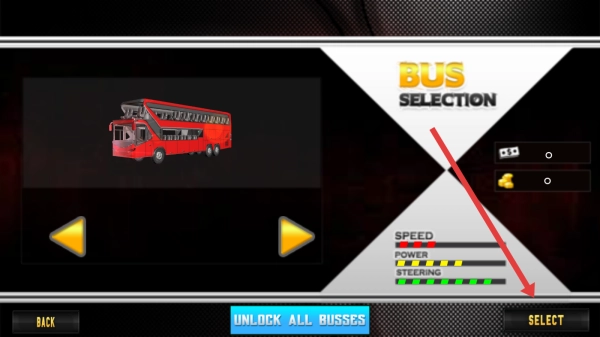 在车辆选择界面,选定红色双层巴士后,点击右下角的SELECT按钮,即可进入驾驶关卡。