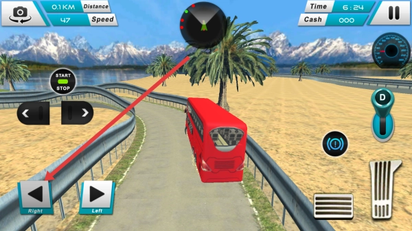 在驾驶时,可借助左下角的Right和Left按钮操控巴士转向,使其在沙漠道路上平稳行进。