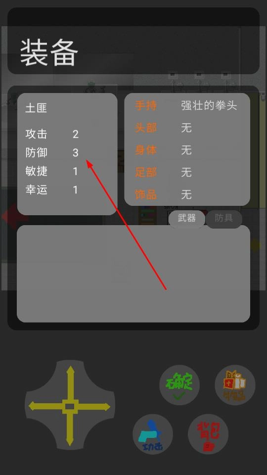 打开装备界面后,查看角色“土匪”的各项属性:攻击值为2点、防御值3点、敏捷值1点、幸运值1点;该角色当前手持的武器是强壮的拳头,头部、身体等关键部位暂时没有穿戴任何防具。接下来需要依据这些属性数据,制定出对应的战斗策略。